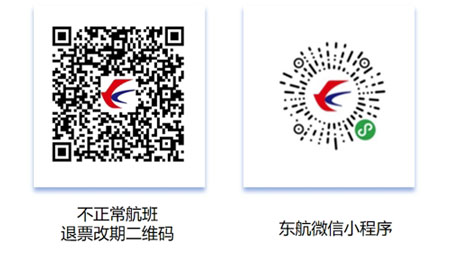 温馨提醒:您可登录东航官网(www.ceair.com)、APP、微信服务号、小程序,或致电东航客服热线95530通过AI语音自助查询航班动态,如遇航班延误或取消,也可通过上述渠道免费办理机票退票或改期。请通过扫描以下二维码并参考二维码内图文指引进行相应操作: