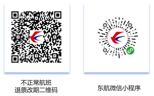 温馨提醒:您可登录东航官网(www.ceair.com)、APP、微信服务号、小程序,或致电东航客服热线95530通过AI语音自助查询航班动态,如遇航班延误或取消,也可通过上述渠道免费办理机票退票或改期。请通过扫描以下二维码并参考二维码内图文指引进行相应操作: