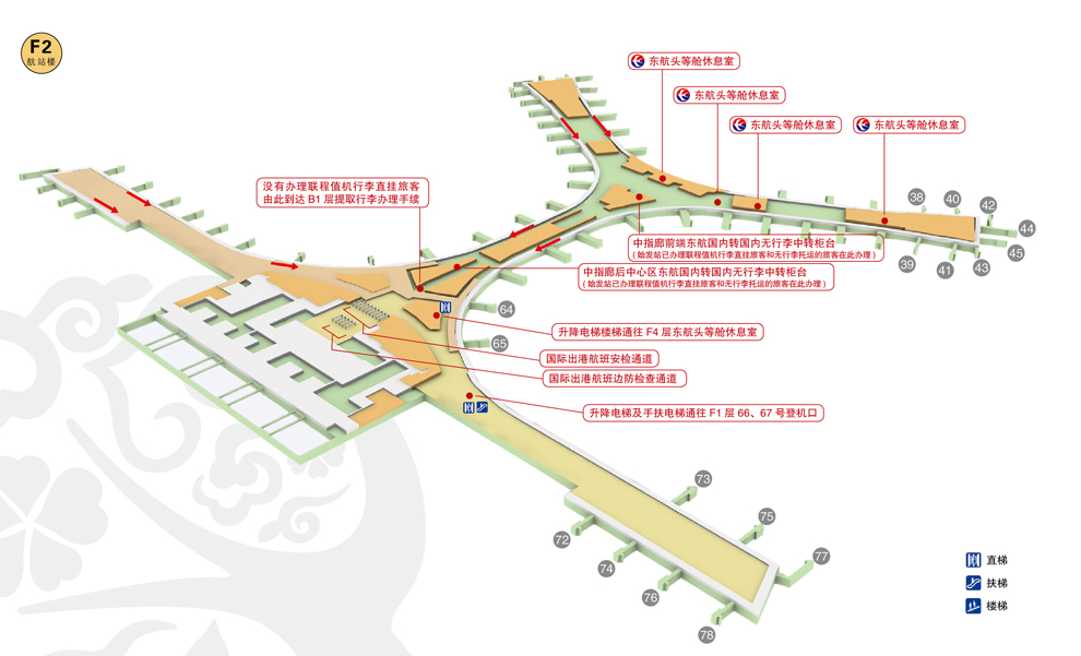 无托运行李中转旅客也可前往候机楼F2层前中心、后中心或远机位到达中转区办理中转值机手续。
