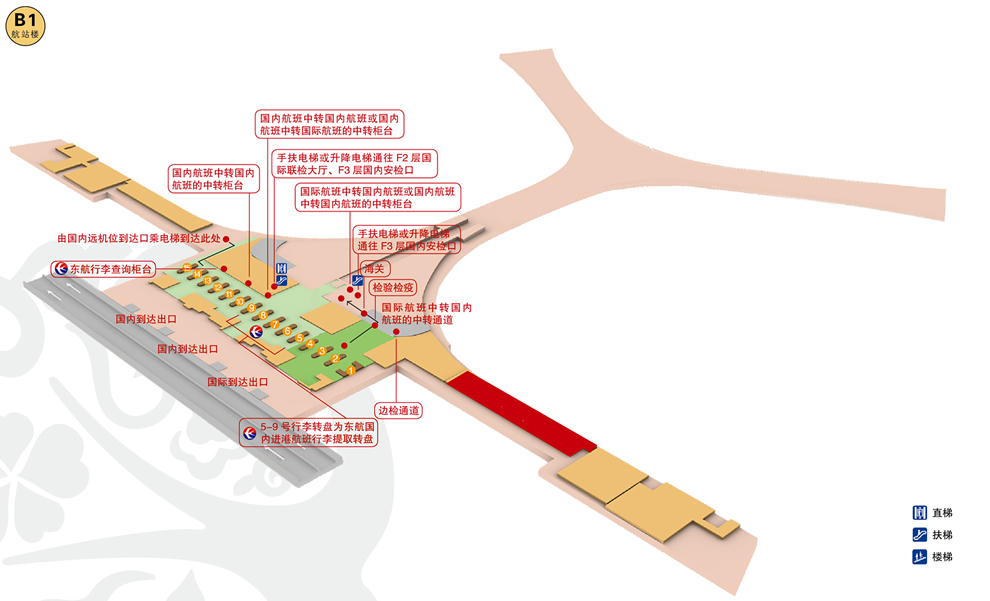 国内行李提取转盘:国内到达大厅B1层5-8号东航行李提取转盘,9号转盘为东航与机场地服共用转盘。