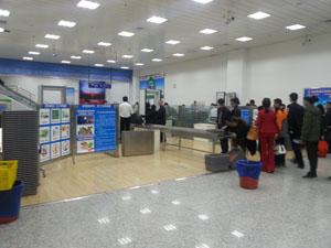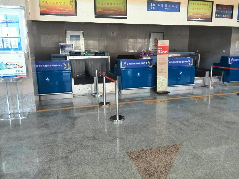 候机楼设有2条安检通道,其中1条普通旅客通道、1条为员工通道。